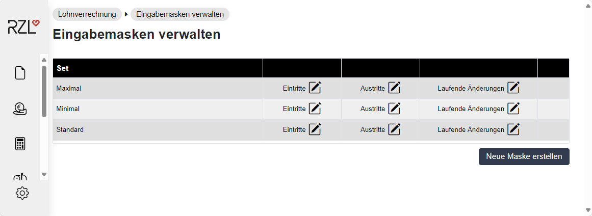 Sie können hier für Eintritte, Austritte und Laufende Änderungen Eingabemasken bearbeiten bzw. neue Eingabemasken erstellen. Drei Vorschläge „Maximal", „Minimal" und „Standard" stehen im RZL Klientenportal bereits zur Verfügung. Diese Vorschläge können jederzeit abgeändert und angepasst werden.