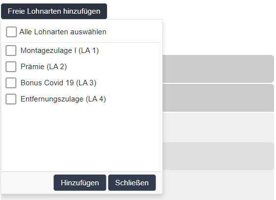 (2) Die freien Lohnarten können nach Anwahl der Schaltfläche Freie Lohnarten hinzufügen (2) durch ein Hackerl ins Kästchen und Hinzufügen in die Eingabemaske übernommen werden.