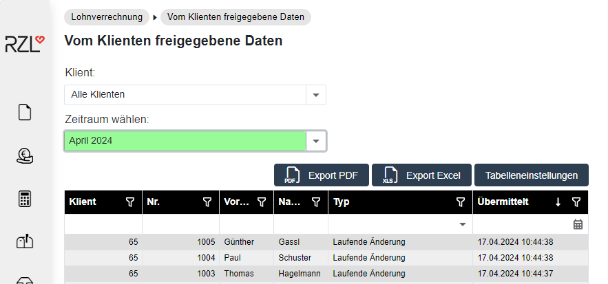 Der in den Stammdaten hinterlegte Klientensachbearbeiter erhält nach der Freigabe durch den Klienten zunächst eine E-Mail-Benachrichtigung. Voraussetzung für die E-Mail-Benachrichtigung ist die Aktivierung im Programmteil Stammdaten/Portal/E-Mail Einstellungen Wird der Klient anschließend in der RZL Lohnverrechnung geöffnet, können die Vorerfassungen automatisch übernommen werden. Eine detaillierte Beschreibung dazu finden Sie im Handbuch RZL Lohn-/Gehaltsverrechnung.