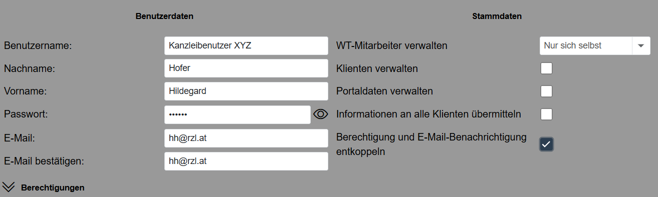 Für die Anlage eines Kanzleibenutzers im RZL Klientenportal sind zwingend Benutzername und Passwort zu vergeben.