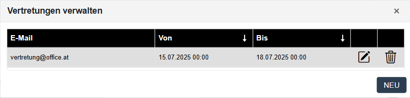 Die Anwahl des ersten Symbols (1) ermöglicht die Eingabe der E-Mail-Adresse und des Zeitraums für Vertretungen. Innerhalb des eingetragenen Zeitraums werden die E-Mails an den Benutzer UND die hier eingetragene E-Mail versendet.