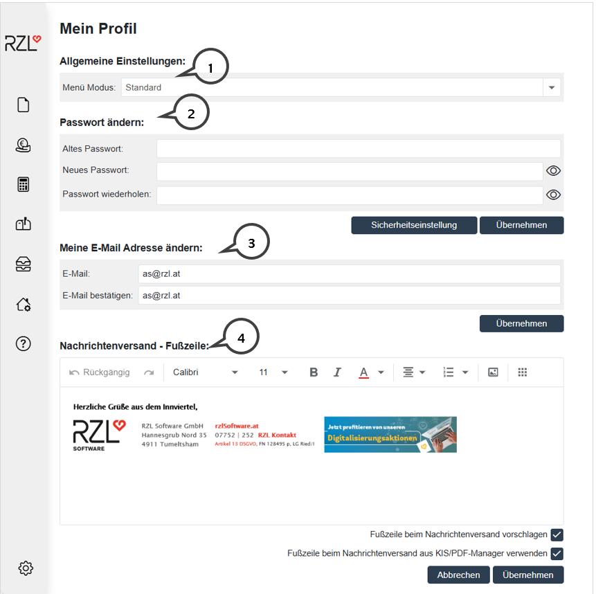 Die E-Mail Adresse, die bei Ihrem Kanzlei-Benutzer hinterlegt ist, können Sie im Bereich Meine E-Mail Adresse (3) ändern.
