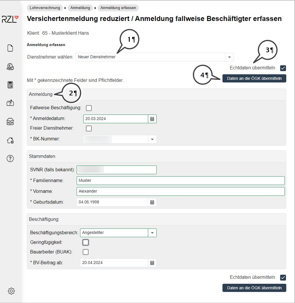 Sie erfassen die Daten der Anmeldung und die Vorerfassung der weiteren Stammdaten der Dienstnehmer in zwei aufeinanderfolgenden Schritten. Nach dem Login in den Klientenbereich des RZL Klientenportals wählen Sie den Programmteil Lohnverrechnung / Anmeldung / Anmeldungen erfassen an. Sie können in diesem Programmteil die sogenannte Versichertenmeldung reduziert und die Anmeldung fallweise Beschäftigter erfassen.