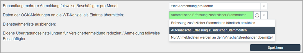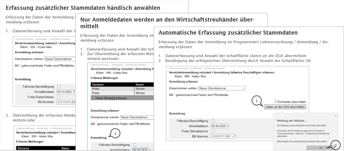 Wir empfehlen die Verwendung der Automatischen Erfassung zusätzlicher Stammdaten. Die Klientenbenutzer können die Erfassung der Anmeldedaten, das Senden der Meldung, die Erfassung weiterer Stammdaten und die Freigabe an den Wirtschaftstreuhänder ohne Unterbrechung mit einem vorgegebenen Workflow durchführen.