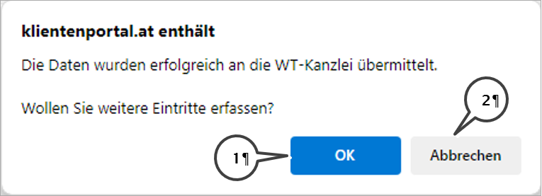- Wählen Sie die Schaltfläche Daten an die ÖGK übermitteln an, um die Daten an die Österreichische Gesundheitskasse zu übermitteln. Sollten die erfassten Daten fehlerhaft oder unvollständig sein, erhalten Sie eine Fehlermeldung und die Daten werden nicht übermittelt. Nachfolgende Meldung wird nach Anwahl der Schaltfläche Daten an die ÖGK übermitteln angezeigt. Der zuständige Mitarbeiter in der WT-Kanzlei erhält eine E-Mail-Benachrichtigung, dass eine Meldung an die ÖGK erfolgt ist. Im Kanzleibereich des Portals steht ein Protokolleintrag für die durchgeführte Meldung zur Verfügung.
