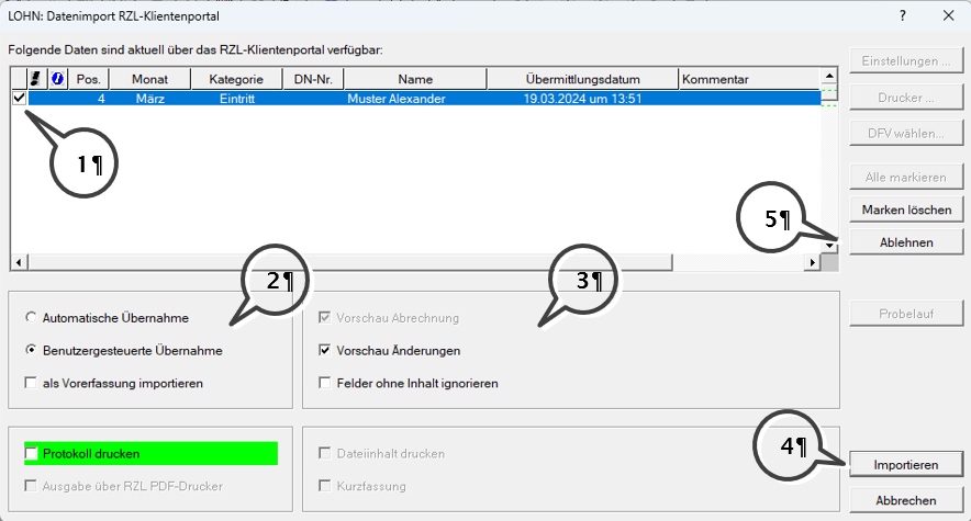- Durch Anwahl der Schaltfläche Importieren werden die Daten der Dienstnehmer mit einem Häkchen in der ersten Spalte in das Lohnverrechnungsprogramm importiert.