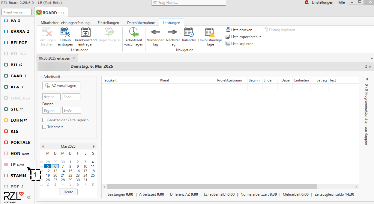 Die Leistungserfassung ist mitarbeiterbezogen. Standardmäßig wird der heutige Tag geöffnet. Wir empfehlen Ihnen, die Leistungserfassung täglich vorzunehmen.