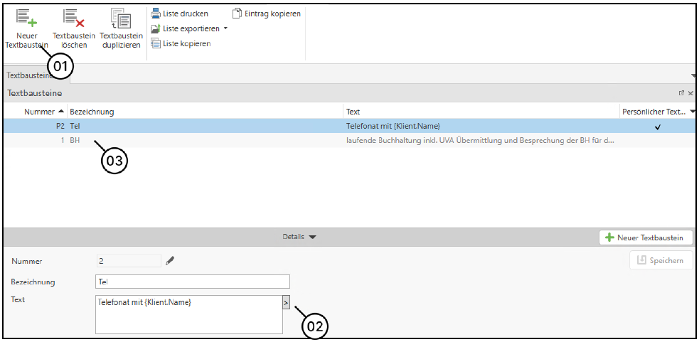 Die in grauer Schrift dargestellten Textbausteine (3) sind allgemeine kanzleiübergreifende Textbausteine und können in der Leistungserfassung nicht geändert werden.