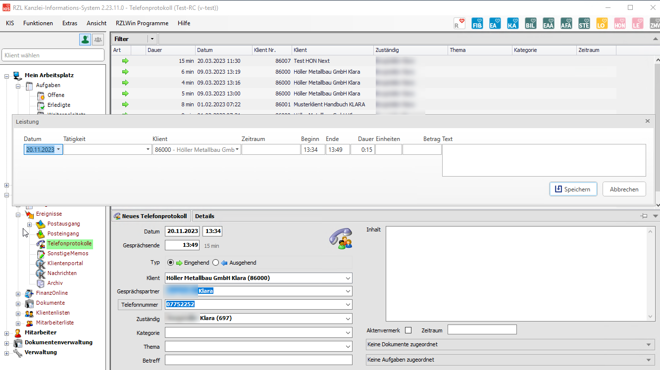 Ansicht im KIS beim Erfassen eines Telefonprotokolls mit der Option Leistungen erfassen