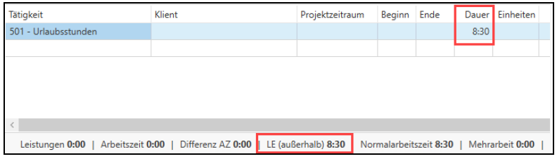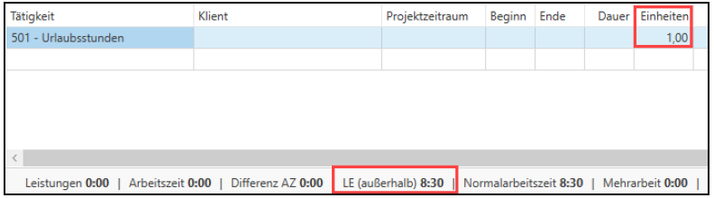 In der Leistungserfassung ist bei Urlaub nach Stunden das Feld Dauer aktiv und bei Urlaub nach Tagen das Feld Einheiten.