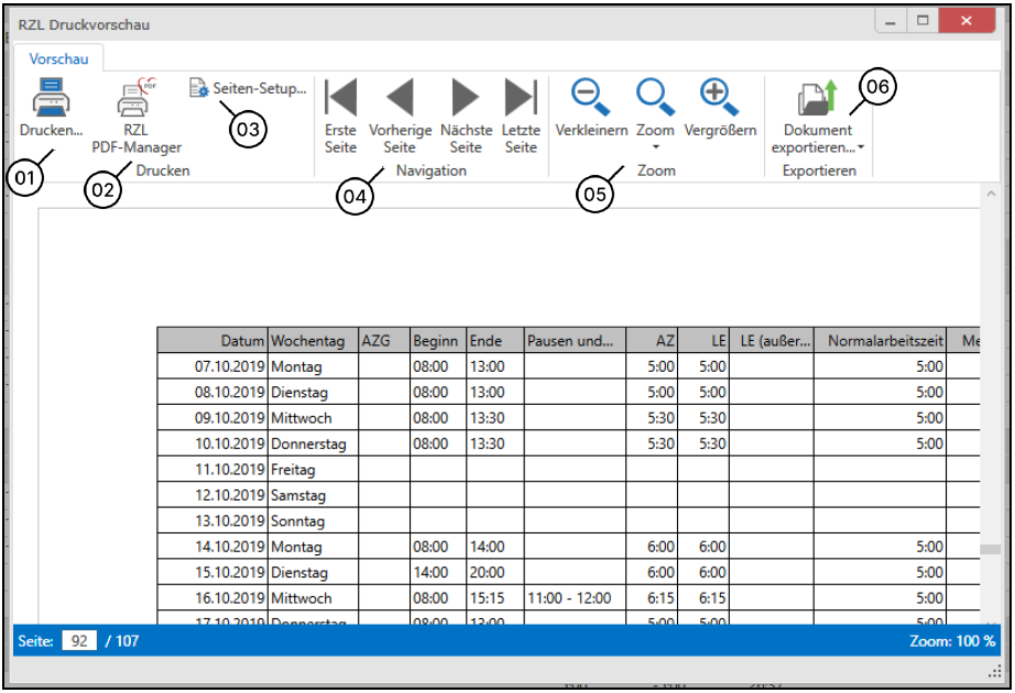 Mittels der Navigation (4) können Sie die Seiten in der RZL- Druckvorschau wechseln.