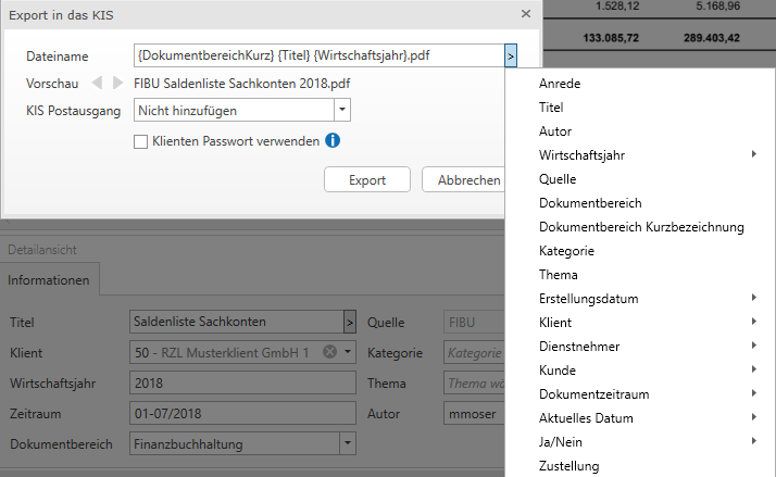 Hier können Sie markierte Dokumente mit der Schaltfläche KIS (STRG + I) in das KIS hinzufügen. Im Fenster Export in das KIS vergeben Sie den Dateinamen für das Dokument. Der Dateiname kann aus den bestehenden Kategorien zusammengestellt werden oder kann auch manuell überschrieben bzw. vergeben werden. Sie können auch einen Postausgang erstellen lassen. Die Schaltfläche Klienten Passwort verwenden erlaubt Ihnen das Klienten Passwort zu setzen. Klicken Sie abschließend auf Export.