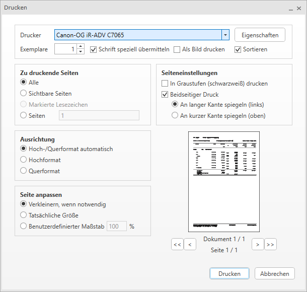 Mit der Schaltfläche Drucken (STRG + P) können Sie ausgewählte Dokumente ausdrucken.