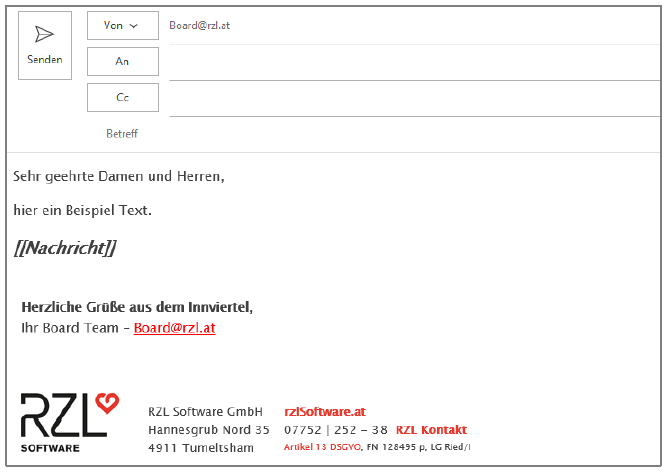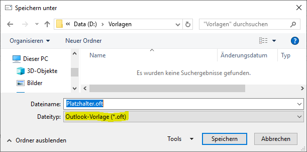Mit der Box Vorlage können Sie eine Outlook Vorlage auswählen. Um den Text der E-Mail Nachricht an eine spezielle Position in der Vorlage einfügen zu können, erstellen Sie eine neue E-Mail Vorlage und fügen Sie den Platzhalter [[Nachricht]] an die gewünschte Position ein. Dieser Platzhalter kann formatiert werden, d.h. Schriftart, Schriftfarbe, Schriftgröße, etc. werden beibehalten. Speichern Sie die Vorlage mit Hilfe der „Speichern unter“ Funktion des Microsoft Outlooks in das Dateisystem. Wichtig dabei ist der Dateityp „Outlook-Vorlage (*.oft)“.
