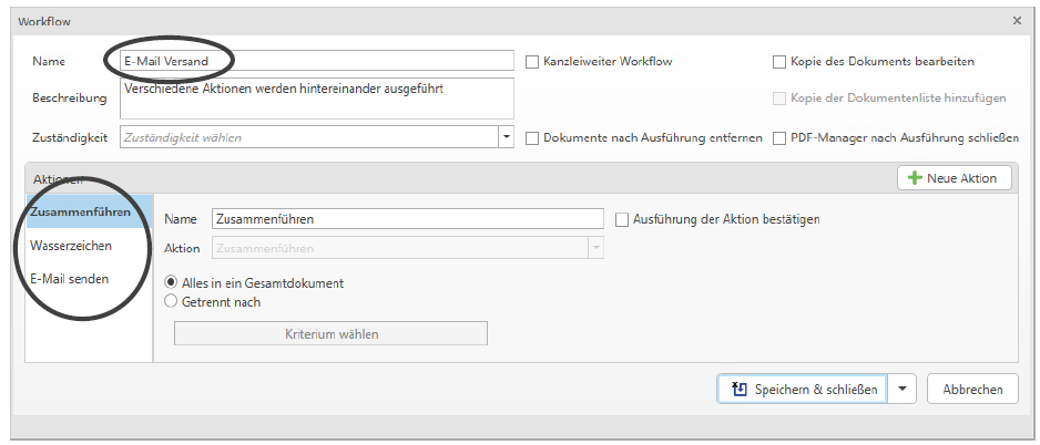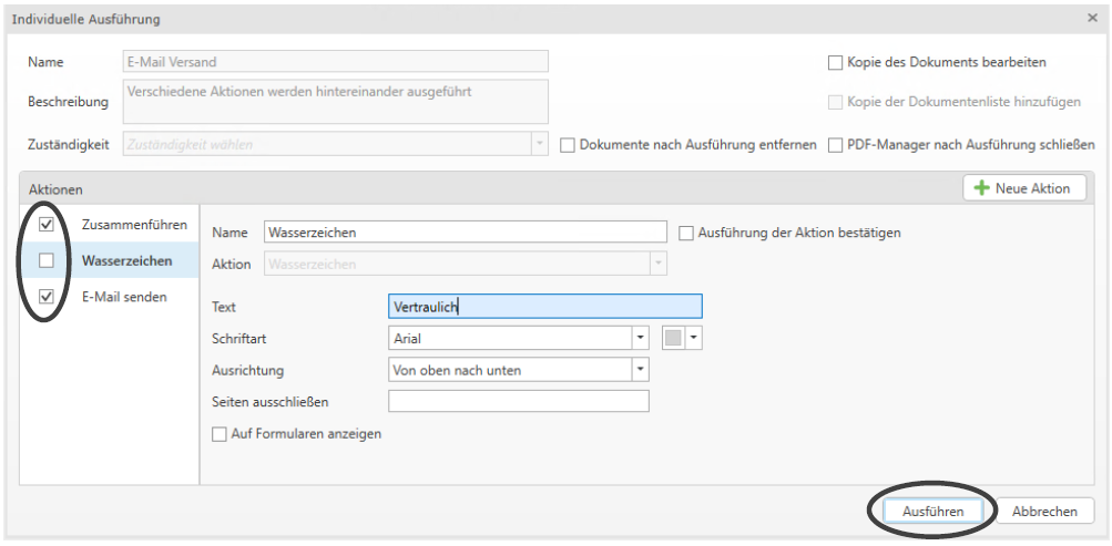 Wenn Sie im Workflow eine bestimmte Aktion nicht ausführen möchten, entfernen Sie das Häkchen bei der jeweiligen Aktion. Klicken Sie anschließend auf Ausführen um die Aktion(en) durchzuführen.