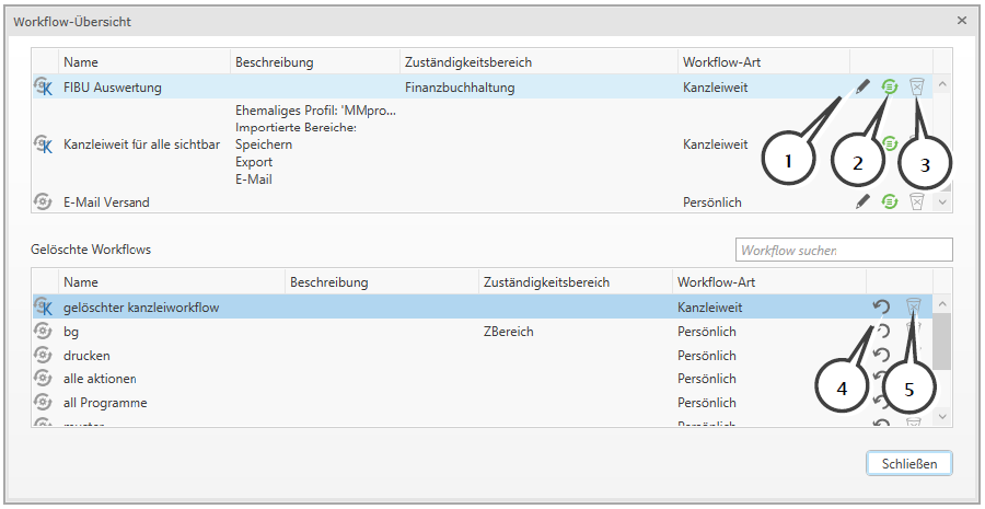 Des Weiteren können Sie im unteren Bereich gelöschte Workflows wiederherstellen (4) oder diese endgültig zu löschen (5). Danach ist keine Wiederherstellung möglich. Kanzleiweite Workflows werden nur der Benutzergruppe KIS-Administrator dargestellt und können somit nur von dieser wiederhergestellt werden.